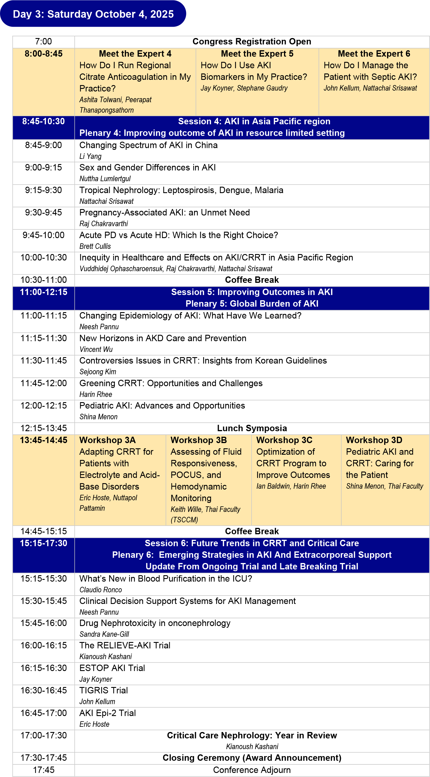 Ballroom 1-3 Workshop 3A Adapting CRRT for Patients with Electrolyte and Acid-Base Disorders Chair: Anutra Chittinandana, Surachet Vongsanim Eric Hoste, Nuttapol Pattamin |